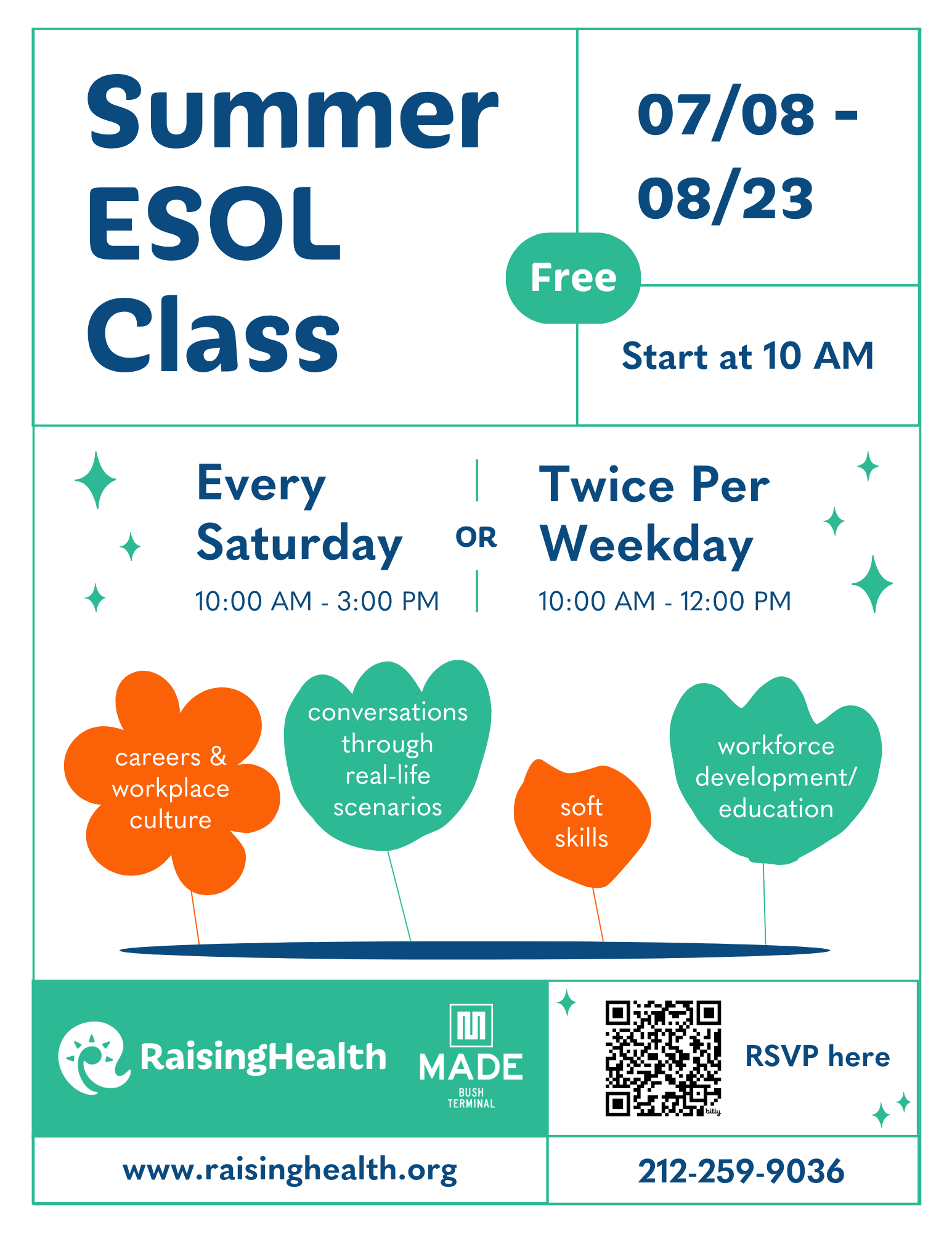 Want to learn English or improve English skills you already have? Join our free ESOL classes! We are offering classes at Beginner, Intermediate, and Advanced levels, with availability on both weekdays and weekends starting in September. Learn more and sign up at bit.ly/RHesolreg or call (212) 256-9036!