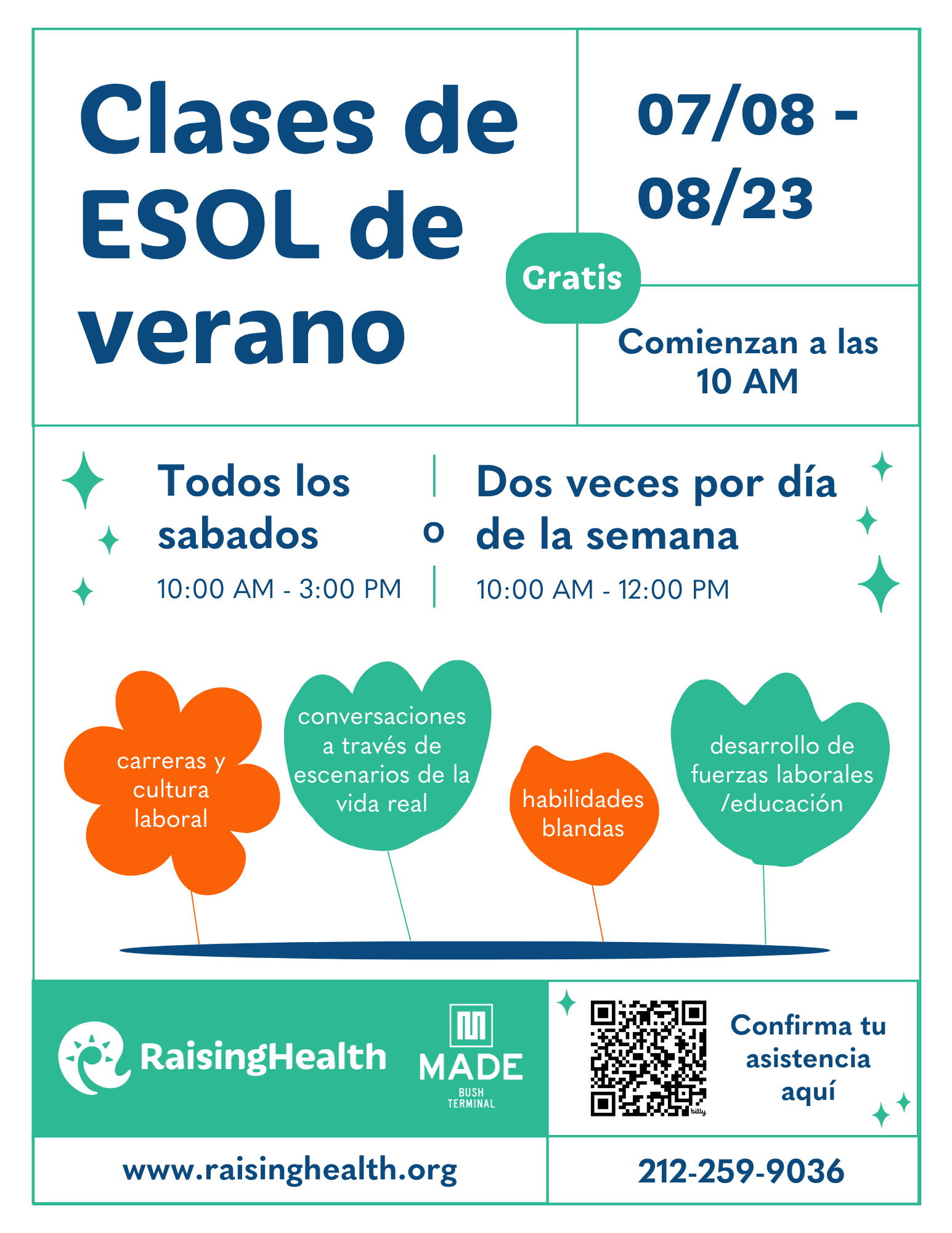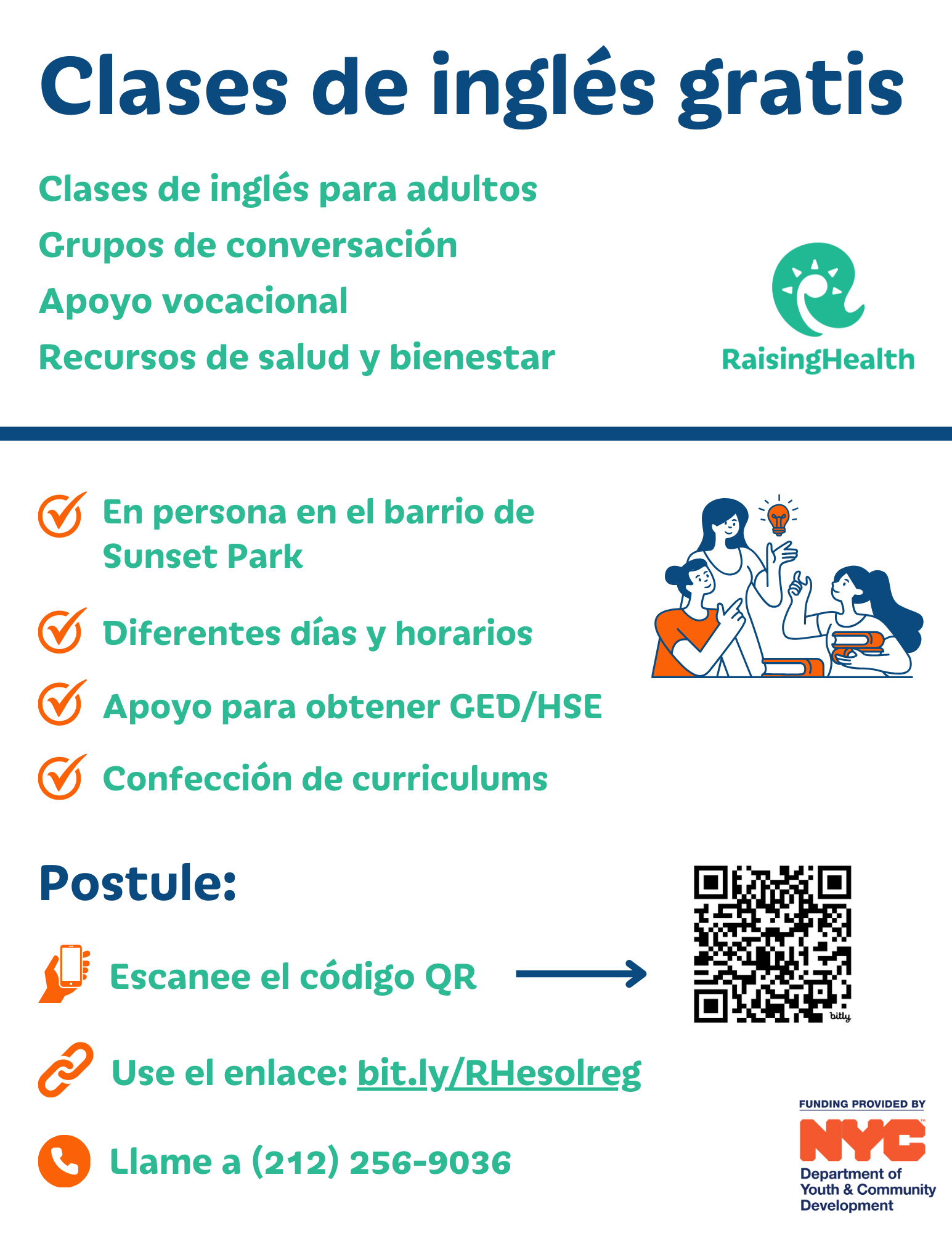 ¿Quiere aprender inglés o mejorar sus habilidades? ¡Únase a nuestras clases gratuitas de ESOL! Ofrecemos clases de nivel principiante, intermedio y avanzado, disponibles entre semana y fines de semana a partir de septiembre. ¡Infórmese e inscríbase en bit.ly/RHesolreg o llame al (212) 256-9036!